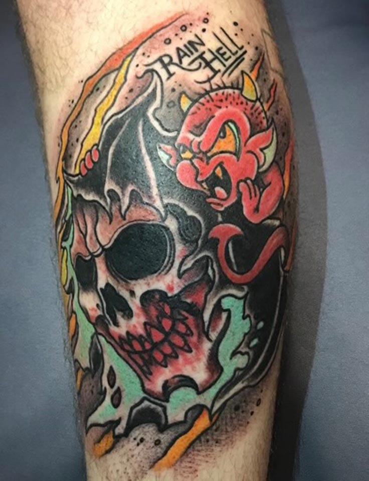 American Traditional, Color, Skull, Lettering and Script
